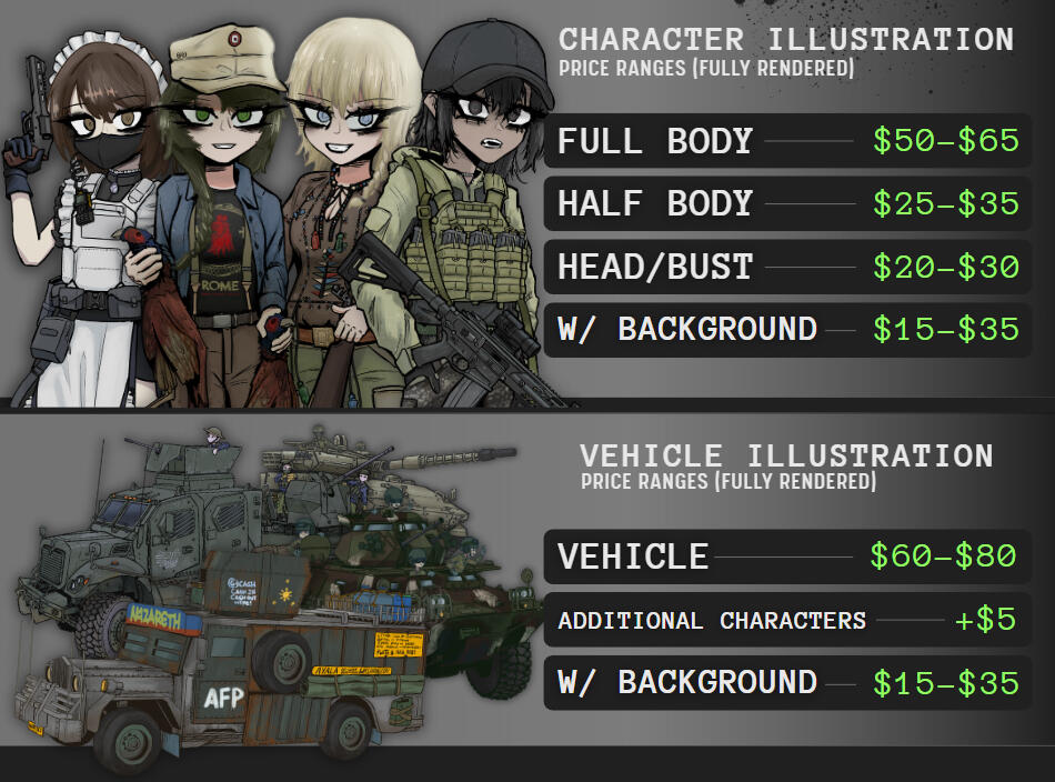 Note: Complexity is the arguably main factor when it comes to pricing. For reference: a character drawn wearing casual clothing will always be cheaper than a one wearing tactical armor.