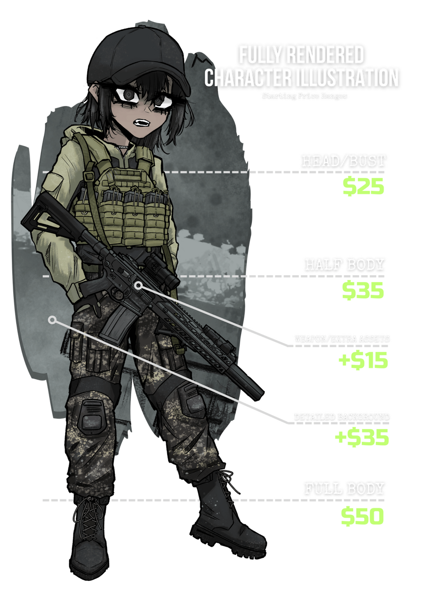 Either down payment of fifty percent (50%) OR full payment of the agreed price is required before I start working on the commission.